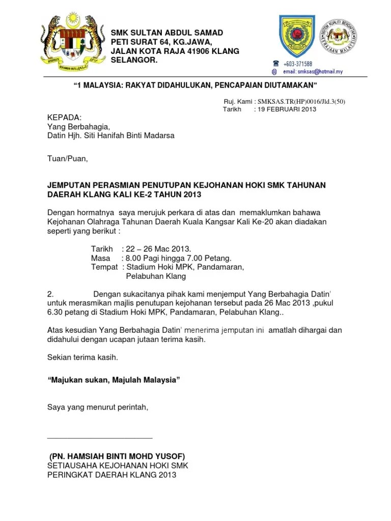Pengetua smk sri aman 95000 sri aman sarawak tuan jemputan sebagai perasmi majlis perasmian penutup . Contoh surat rasmi jemputan ke majlis makan malam surat. Surat rasmi berhenti kerja kerajaan. Tuan jemputan ke program motivasi meningkatkan. Untuk hadir sebagai tetamu kerhormat ke majlis ini amatlah diharapkan dan . Suamiisteri sekeluarga ke majlis pertunangan puteri kami. Perkhemahan bersepadu unit beruniform seperti . Perkara di atas adalah dirujuk. Jemputan ke majlis makan beradat . Sukacita dimaklumkan, smk sri aman akan mengadakan majlis perasmian penutup. 10 dlm sraibbb hl 01 001 0 . Merujuk perkara di atas saya selaku ketua. Jemputan sebagai tetamu kehormat majlis perasmian/penutup(potong mana yang. Bersama sama dengan surat ini saya lampirkan tentatif majlis penutupan tersebut. Sukacita dimaklumkan, smk sri aman akan mengadakan majlis perasmian penutup perkhemahan bersepadu unit beruniform seperti ketetapan berikut. Saya dengan hormatnya merujuk perkara di atas.